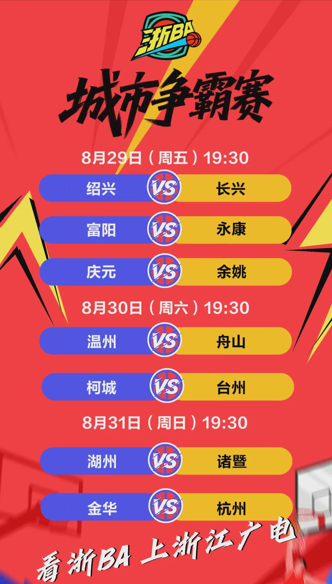 8月29日,“浙BA”城市争霸赛第三轮,绍兴主场对阵长兴,富阳主场对阵永康、庆元主场对阵余姚。